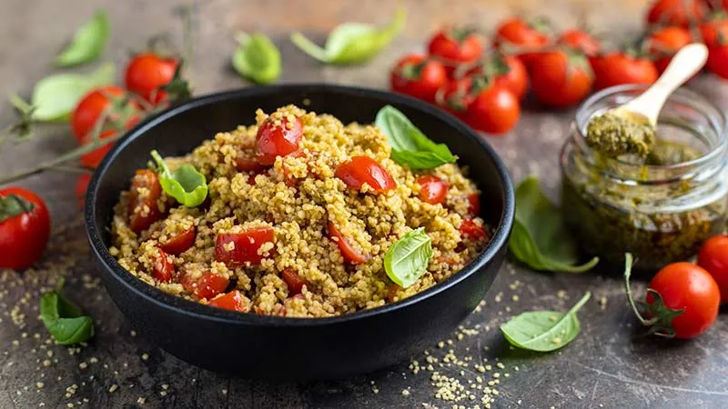 Il cous cous con pesto e pomodorini è un inno alla semplicità mediterranea che si trasforma in un'esplosione di freschezza. Questo piatto promette un viaggio sensoriale dove la delicatezza del semolino incontra l'intensità erbacea del pesto e la dolcezza concentrata dei pomodorini, regalando un primo piatto che sa di estate in ogni boccone. Un equilibrio perfetto tra tradizione e praticità contemporanea.