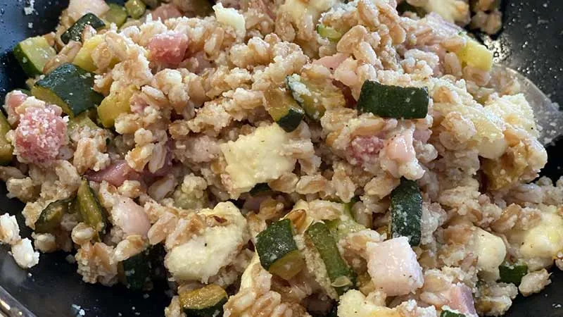 Il carattere del piatto nasce dall'armonioso contrasto tra la consistenza morbida e rassicurante del farro, che assorbe ogni aroma, e il tocco croccante della pancetta affumicata, che si scioglie in note salate. Le zucchine, saltate fino a un dorato delicato con aglio e olio extravergine, rilasciano una dolcezza terrosa, mentre la mozzarella aggiunge freschezza cremosa. Il finale è affidato al Parmigiano, che con le sue scaglie sapide lega il tutto in un abbraccio di sapienza casearia.