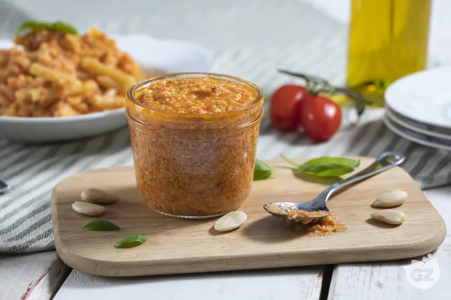 dove la dolcezza dei pomodori Pizzutelli si sposa con il carattere rustico delle mandorle, promettendo un'esplosione di freschezza che trasforma un piatto di pasta in un viaggio sensoriale.