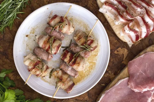 La magia risiede nei contrasti tessuti con maestria: la pancetta croccante che cede il suo grasso aromatico, avvolgendo gli spiedini in un'armatura dorata, mentre il vino bianco sfuma ogni nota grassa in un fondo vellutato e profumato di rosmarino e salvia. È un gioco di texture e sapidità, dove il pepe nero appena macinato risveglia l'insieme senza sopraffarlo.
