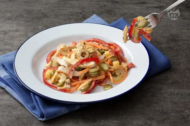 Il petto di pollo grigliato, tenero e leggermente affumicato, dialoga magistralmente con la freschezza croccante delle verdure tagliate a julienne: le carote dolci, il sedano aromatico e i peperoni rossi carnosi. L'incontro tra le olive verdi sapide e i cetriolini sottaceto spezza la cremosità della salsa, un'emulsione vellutata dove la senape delicata tempera la ricchezza della maionese senza sopraffarla, mentre il groviera aggiunge note di nocciola tostata.
