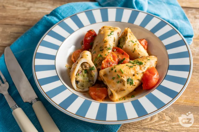 Cotti in un umido vivace di pomodorini ciliegino e vino bianco, i calamari si trasformano, diventando teneri e impregnati di un sugo brillante che ne esalta ogni sfumatura. Piatto dall'eleganza conviviale, è un'esperienza che racconta di porti, di tradizione e di una cucina che sa essere insieme ricca e sorprendentemente leggera.