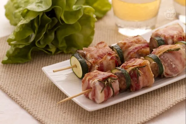 La magia avviene quando il grasso della pancetta si fonde con le carni bianche durante la cottura, creando una croccante corazza dorata che custodisce la succosità del pollo. Le zucchine e i funghi, infilzati con sapienza, non sono semplici comprimari: assorbono i profumi del rosmarino e rilasciano note terrose che bilanciano la ricchezza delle carni.