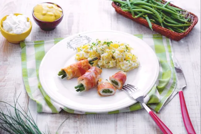 All'interno, i fagiolini freschi mantengono una lieve resistenza al dente, contrastando piacevolmente con la morbidezza del pollo e la nota piccante della senape, mentre il prosciutto crudo avvolge il tutto con la sua sapidità profumata. Il contorno di patate allo yogurt greco, arricchito da erba cipollina e un filo di latte, offre una freschezza cremosa che bilancia il piatto con delicatezza, creando un gioco di temperature e consistenze.
