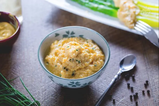 Ogni cucchiaino rivela un dialogo sapiente tra il burroso fondente dei tuorli setacciati e il morso gentile della senape, mentre l'olio di girasole dona una nota erbacea e leggera. L'erba cipollina fresca, tritata finemente, aggiunge scoppi di freschezza pungente che risvegliano il palato, contrastando piacevolmente con la profondità terrosa del pepe nero macinato al momento.