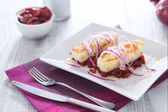 Il contrasto sensoriale è magistrale: la polpa bianca e delicata del merluzzo si adagia su un battuto di pomodori secchi che offre una consistenza vellutata e un concentrato dolce-acidulo. A completare, la cipolla di Tropea cruda, tagliata finemente, introduce una croccantezza fresca e una nota lievemente piccante che pulisce il palato, mentre un filo di olio extravergine lega gli elementi con il suo fruttato elegante. Perfetto per una cena informale ma curata, unisce la praticità di una cottura veloce al risultato di un piatto dal profilo netto e soddisfacente. L'effetto finale è quello di un quadro dai colori vivaci e dai sapori ben definiti, che sa di mare e di sole.