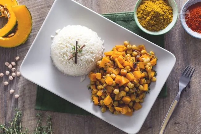 La zucca, cedevole e caramellata, dialoga in perfetto equilibrio con la consistenza pastosa dei ceci, mentre il curry e la curcuma tessono un manto dorato dal profumo avvolgente. Ogni boccone rivela il contrasto tra la delicatezza fondente dell'ortaggio e la lieve sapidità dei legumi, esaltato dal guizzo finale della paprika piccante che risveglia il palato.