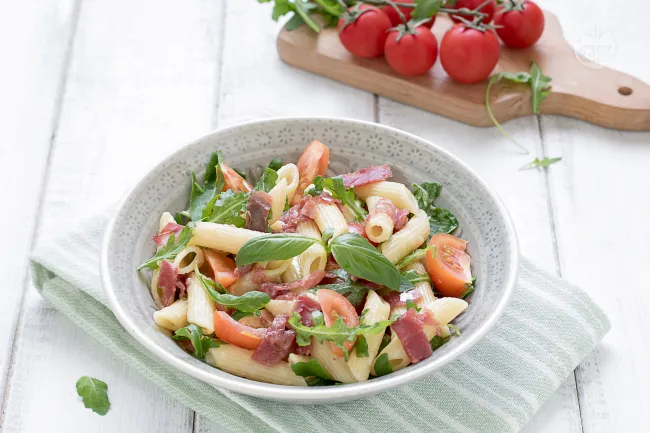 Un'armonia di sapori che canta l'estate italiana, dove la delicatezza cremosa incontra il guizzo sapido in un abbraccio di freschezza. Questa pasta non è solo un primo piatto, è una promessa di piacere immediato e di eleganza informale, perfetta per chi cerca un'esperienza gustativa che sa di sole e di genuinità. La cremosità avvolgente dello stracchino dialoga con la nota intensa e leggermente ferrosa della bresaola, mentre i ciliegini scoppiano in bocca rilasciando un'acidità vivace che riequilibra il tutto.