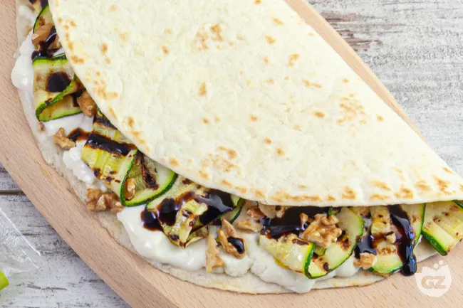 sapori che trasforma la semplicità in eleganza: la piadina si riveste di carattere con l'abbraccio cremoso dello stracchino fuso e la rusticità delle zucchine grigliate.