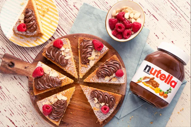 La farina di mandorle, tostata e intensa, costruisce un impasto granuloso che trattiene umidità e profumo, mentre la Nutella® fonde in calde venature che si intrecciano con l'acidulo vivace dei lamponi freschi. Le scaglie di mandorle croccanti completano il quadro, aggiungendo un finale sonoro a ogni boccone, tra note caramellate e un retrogusto burroso che persiste.