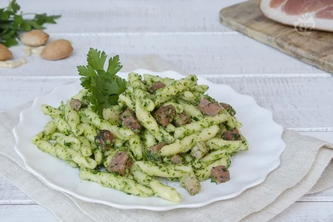 Il pesto di prezzemolo rivela una personalità sorprendente: la sua vibrante nota vegetale, sostenuta dalla dolcezza cremosa delle mandorle e dei pinoli, incontra il carattere deciso dello speck croccante. Ogni boccone offre un contrasto sensoriale magistrale tra la morbidezza avvolgente della salsa e la sfrigolante consistenza del salume, mentre il Parmigiano Reggiano aggiunge profondità con la sua sapidità cristallina.