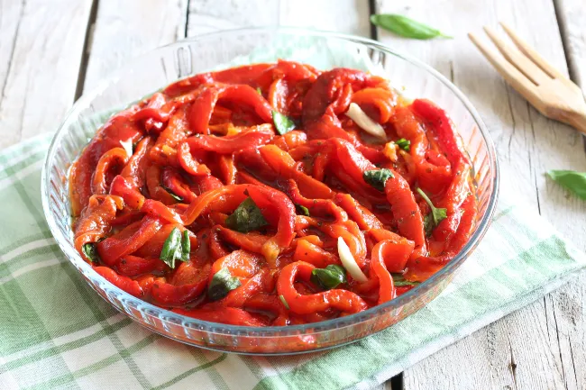 L'equilibrio nasce dal contrasto tra la calda dolcezza dei peperoni e il tocco crudo e vibrante del condimento: l'aglio a filetti dona una punta pungente che non sovrasta, l'origano secco regala un'eco aromatica di macchia mediterranea, mentre le foglie di basilico fresco spezzate a mano rilasciano note di freschezza erbacea che risvegliano l'insieme. Ogni ingrediente gioca un ruolo preciso, sostenuto dall'olio extravergine che lega i sapori con un filo dorato e fruttato.