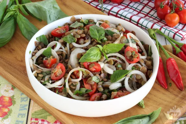 Un'insalata che unisce la rustica consistenza delle lenticchie alla freschezza estiva dei pomodorini, creando un piatto dal carattere deciso ma equilibrato. Le lenticchie, cotte al dente per mantenere una piacevole croccantezza, si sposano con la dolcezza acida dei pomodorini e il pungente aroma del cipollotto fresco.