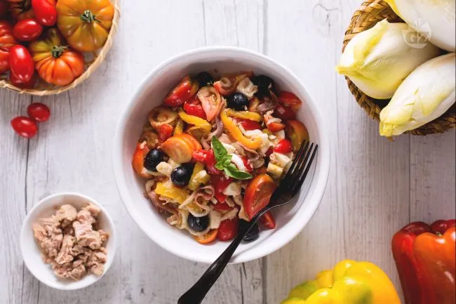 Questa insalata estiva è un'esplosione di colori e sapori mediterranei, dove la dolcezza dei peperoni arrostiti si fonde con la sapidità del tonno e la freschezza della mozzarella. La combinazione crea un piatto unico ricco di contrasti, perfetto per un pranzo leggero ma sostanzioso.