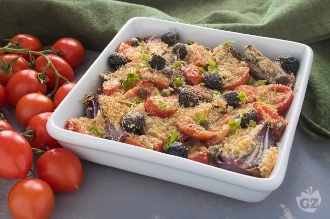 Le cipolle gratinate sono un contorno elegante che trasforma un ortaggio umile in una preparazione ricca e invitante. La cottura al forno ammorbidisce la dolcezza naturale delle cipolle, mentre la croccante panatura al parmigiano e pangrattato crea un contrasto di consistenze irresistibile. I pomodorini ciliegino esplodono in succosità, bilanciati dalla sapidità delle olive nere e dal tocco pungente dei capperi.