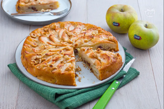 L'emulsione di olio e nocciole frullate crea una base aromatica profonda, mentre il latte di cocco aggiunge una nota cremosa e tropicale. Le mele renette, lasciate con la buccia per un tocco rustico, si ammorbidiscono rilasciando il loro succo, che insieme all'uvetta garantisce una piacevole umidità in ogni fetta.