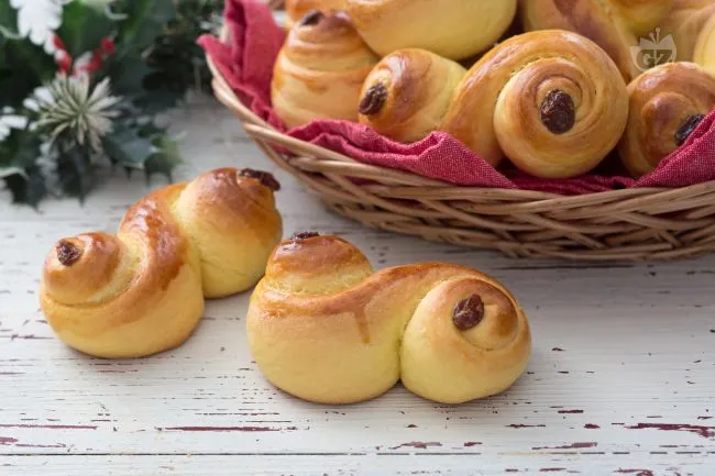 I Gatti di Santa Lucia, o Lussekatter, sono dolcetti svedesi dalla consistenza morbidissima e dal profumo inconfondibile di zafferano. La loro forma a doppia spirale, arricchita da uvette brillanti, li rende un simbolo festivo che unisce eleganza visiva a un sapore dolce e avvolgente. La nota terrosa e leggermente amara dello zafferano si fonde con la dolcezza del burro e del latte, creando un impasto soffice e aromatico che si scioglie in bocca.