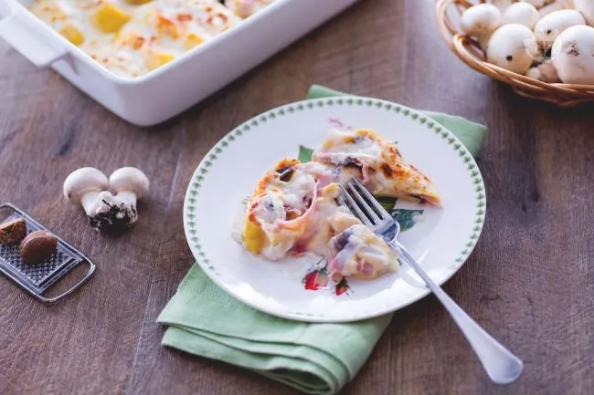 La magia risiede nei contrasti magistrali: la pasta all'uovo, sottile e dorata, avvolge con delicatezza la generosità del ripieno, dove la sapidità carnosa del prosciutto cotto dialoga con la cremosità dell'Emmentaler fuso e l'umami terroso dei funghi champignon. La besciamella, profumata di noce moscata, funge da legante sensuale che unisce le texture in un insieme armonioso, creando quel famoso 'effetto girandola' che al taglio rivela il suo cuore segreto.