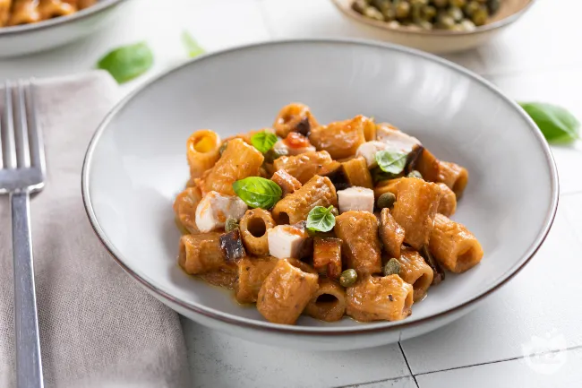 Un primo piatto di mare che unisce la cremosità vellutata della melanzana alla consistenza soda e saporita del pesce spada. La crema di melanzane, arricchita da una base di cipolla stufata e passata di pomodoro, avvolge la pasta in un abbraccio delicato, mentre i cubetti di pesce spada saltati in padella offrono un contrasto di sapidità e freschezza. La sfumatura con vino bianco e la punta acidula dei capperi sott'aceto bilanciano la dolcezza delle verdure, creando un equilibrio perfetto tra terra e mare.