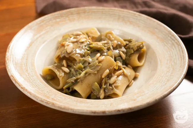 Un primo piatto che unisce la rusticità della pasta corta alla delicatezza dei carciofi e alla sapidità delle acciughe, creando un equilibrio di sapori mediterranei. La morbidezza dei carciofi stufati si fonde con l'untuosità delle acciughe sciolte, mentre i pinoli tostati regalano una piacevole nota croccante e il pecorino aggiunge un finale aromatico e leggermente piccante.