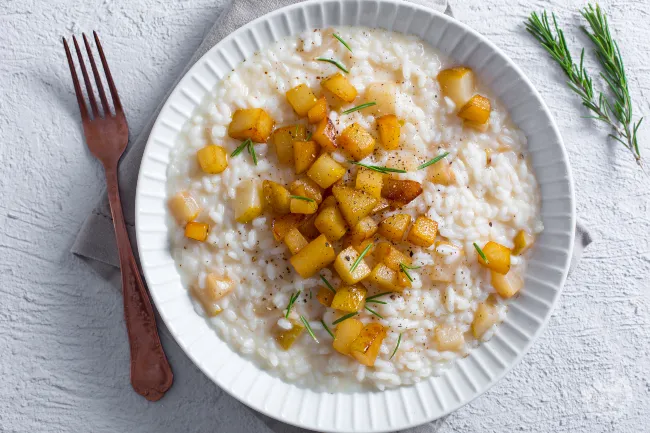 La sfumatura al rum delle pere aggiunge un tocco di calore e complessità, mentre il rosmarino fresco introduce una nota balsamica che pulisce il palato. Lo stracchino, mantecato a fuoco spento, fonde in una crema liscia che lega ogni chicco di riso senza coprirne il sapore.