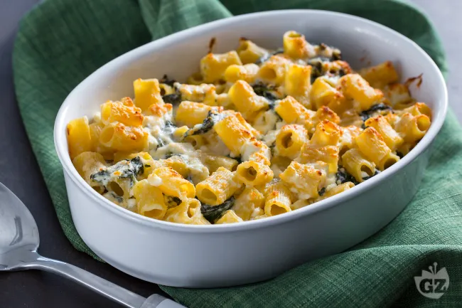 Questa pasta al forno è un primo piatto vegetariano che conquista per il suo equilibrio di sapori e consistenze. La cremosità della ricotta e della feta si fonde con la delicatezza degli spinaci stufati, mentre una doratura croccante in superficie regala un piacevole contrasto. Il Parmigiano Reggiano aggiunge una nota sapida e un profumo intenso che completa l’armonia del piatto.