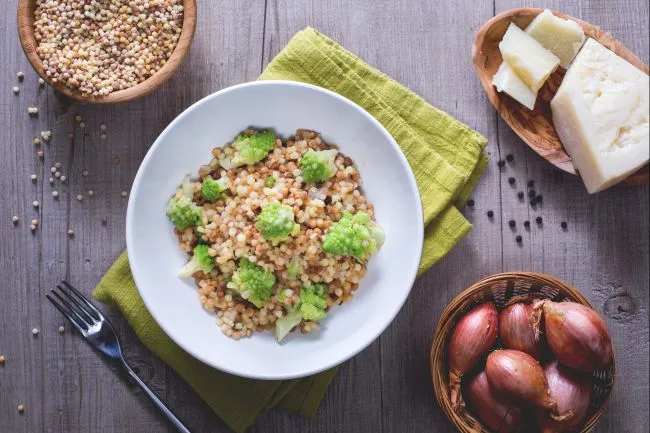 profondamente radicati nella tradizione mediterranea. La tostatura della pasta in padella ne esalta il carattere nocciolato, mentre la cottura lenta nel brodo vegetale la rende incredibilmente avvolgente, capace di assorbire ogni aroma. Il broccolo romanesco, con la sua struttura a frattale, si sfalda leggermente ai bordi durante la cottura, rilasciando una cremosità naturale che lega il tutto, mentre lo scalogno e il timo fresco aggiungono note aromatiche che si bilanciano con la sapidità del Parmigiano Reggiano.