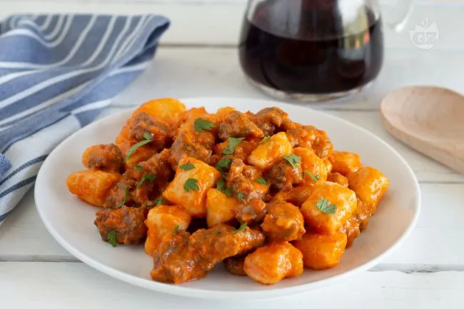 Un primo piatto che unisce la delicatezza degli gnocchi di ricotta alla rusticità di un condimento ricco e avvolgente. La morbidezza degli gnocchi fatti in casa incontra la cremosità dolce dei peperoni frullati e il sapore intenso della salsiccia sfumata al vino rosso, creando un contrasto di consistenze e sapori perfettamente bilanciato.