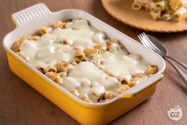 avvolgente, dove la cremosità della besciamella e del formaggio si sposano con il sapore intenso del soffritto, dei funghi e del prosciutto, per un'esperienza gustativa soddisfacente e conviviale.