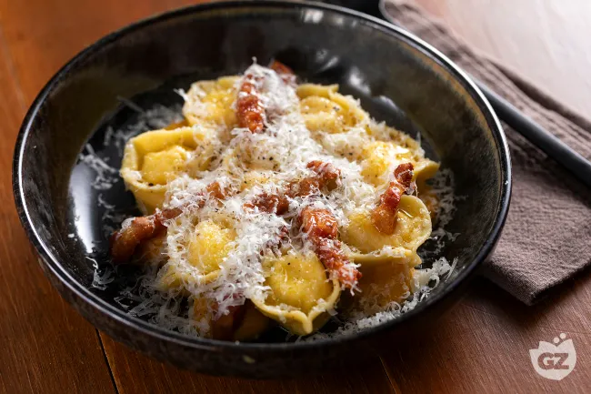 Una rivisitazione elegante e sorprendente della carbonara, dove la tradizione romana incontra la delicatezza autunnale. I tortelli racchiudono un cuore cremoso e sapido di guanciale, pecorino e mascarpone, mentre all'esterno una vellutata di zucca delica e cipolla stufata aggiunge un tocco di dolcezza terrosa che stempera l'intensità del ripieno. La pasta sottile, quasi trasparente, esalta il contrasto tra la croccantezza del guanciale dorato e la morbidezza setosa della farcitura.