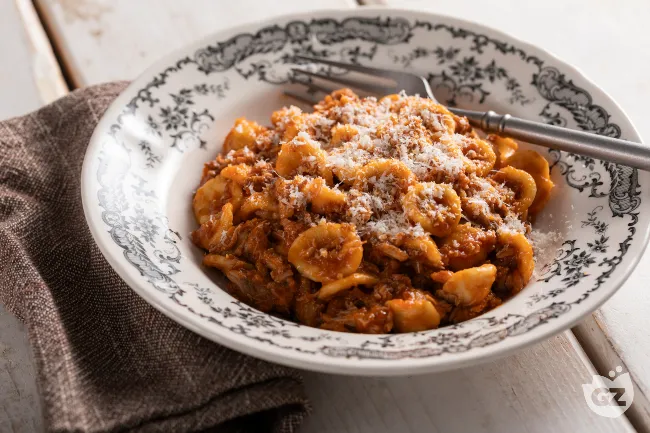 dall'osso dopo ore di lenta infusione con il pomodoro, il vino rosso e il soffritto di verdure, regala una consistenza morbidissima e saporita che si lega perfettamente alla pasta. Il contrasto tra la dolcezza delle carote, la sapidità del sedano e l'aromaticità della cipolla crea una base profumata, mentre il concentrato di pomodoro e la passata donano al sugo una densità setosa e un colore rosso intenso.