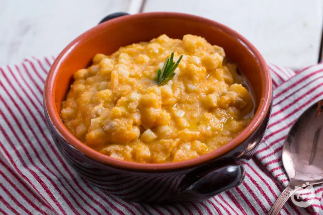 La Minestra delle Favole è un primo piatto robusto e avvolgente, che unisce la rusticità dei legumi alla sapidità della salsiccia in un abbraccio caldo e confortante. La consistenza cremosa della purea di ceci e fagioli si fonde perfettamente con la pasta corta, mentre i tocchi di salsiccia rosolata regalano note intense e un piacevole contrasto di sapori.