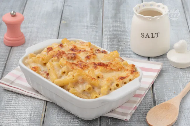 Una pasta al forno senza glutine che conquista per la sua ricchezza cremosa e i contrasti di sapore. La besciamella preparata con amido di mais avvolge i sedanini rigati in una consistenza vellutata, mentre i formaggi si fondono in un cuore filante e aromatico. La pancetta affumicata, scottata fino a diventare croccante, aggiunge note sapide e una piacevole punta di croccantezza che contrasta con la morbidezza dell'insieme.