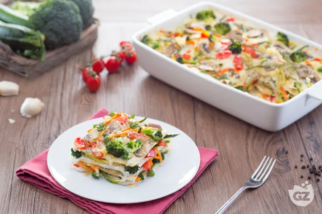 I funghi champignon e i broccoli regalano un contrasto di consistenze, mentre i pomodorini datterini aggiungono una nota acida e brillante che taglia la ricchezza del piatto. Questa ricetta è perfetta per una cena elegante ma informale, adatta a chi cerca un primo piatto sostanzioso e raffinato senza carne, dove ogni strato rivela un equilibrio tra morbidezza della pasta, cremosità della salsa e croccantezza delle verdure.