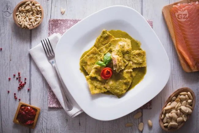 sfoglia sottile e liscia si sposa con la morbidezza del ripieno, mentre la salsa, arricchita da pomodori secchi, pinoli e mandorle, aggiunge un tocco rustico e aromatico che bilancia la delicatezza del pesce. Il contrasto tra la freschezza erbacea del basilico e la sapidità del salmone affumicato crea un equilibrio di sapori raffinato.