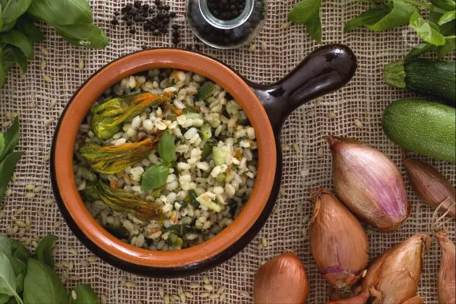L'orzotto con zucchine e fiori di zucca è un primo piatto che incarna l'essenza dell'estate in una ciotola. L'orzo perlato, cotto al dente, offre una consistenza morbida ma con una piacevole resistenza al morso, mentre le verdure di stagione rilasciano tutta la loro freschezza e delicatezza. Il profumo del basilico fresco si sposa con la dolcezza dello scalogno soffritto, creando un aroma invitante che anticipa il gusto.