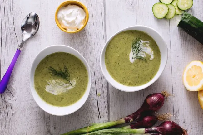 Una vellutata estiva che unisce la freschezza del cetriolo alla cremosità dello yogurt, creando un primo piatto leggero e raffinato. La consistenza è morbidamente setosa, con un profilo aromatico che gioca sul contrasto tra la nota erbacea dell'aneto e la punta agrumata della scorza di limone.