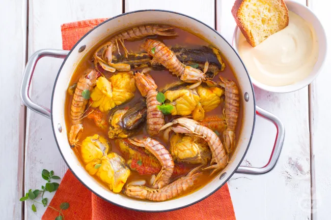 La bouillabaisse è un'esperienza sensoriale che racconta il Mediterraneo in una ciotola. Questa zuppa di pesce marsigliese offre un brodo intenso e profumato, arricchito dallo zafferano e dai semi di finocchio, che avvolge delicati tranci di pesce fresco e crostacei dolci.