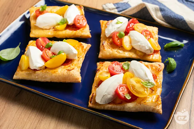 Queste mini tarte tatin salate offrono un'esperienza di sapori e consistenze elegante e sorprendente. La base di pasta sfoglia diventa dorata e croccante, mentre i pomodorini, caramellati dal miele, si ammorbidiscono rilasciando una dolcezza intensa e contrastante con la nota sapida dell'olio. La freschezza della crema di formaggio e dei pomodorini crudi a crudo bilancia perfettamente la ricchezza della cottura, creando un antipasto raffinato e ben strutturato.