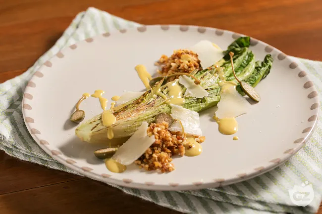 Un antipasto che trasforma la semplicità della lattuga in un'esperienza di sapori e consistenze inaspettate. La grigliatura intensa dona alla verdura un carattere affumicato e dolce, che si sposa magistralmente con la cremosità pungente del formaggio di capra e la nota piccante e leggermente dolce della senape all'acero. La panura croccante di nocciole tostate e pangrattato rustico aggiunge un contrasto tattile fondamentale, mentre i capperi interrompono la ricchezza con una punta di sapidità fresca.