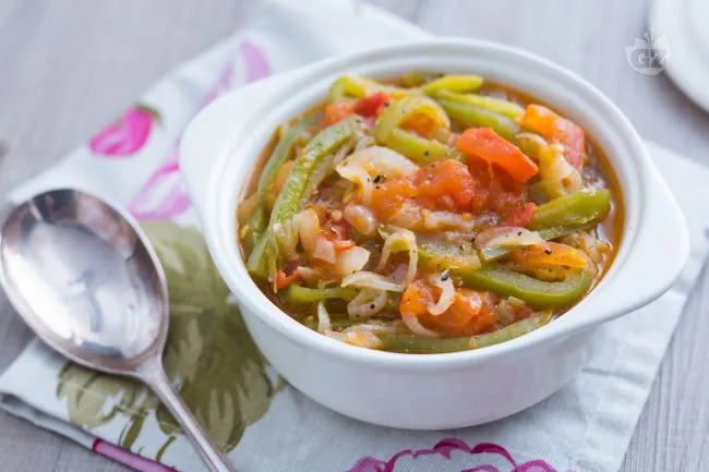 La magia avviene nella pentola: le cipolle si caramellano fino a diventare una base setosa, i peperoni verdi cedono la loro nota erbacea e terrosa, mentre i pomodori ramati si disfano in una salsa vellutata che lega il tutto. Il risultato è un contrasto di consistenze dove ogni verdura mantiene una traccia della sua identità, immersa in un fondo cremoso e profumato di olio extravergine.