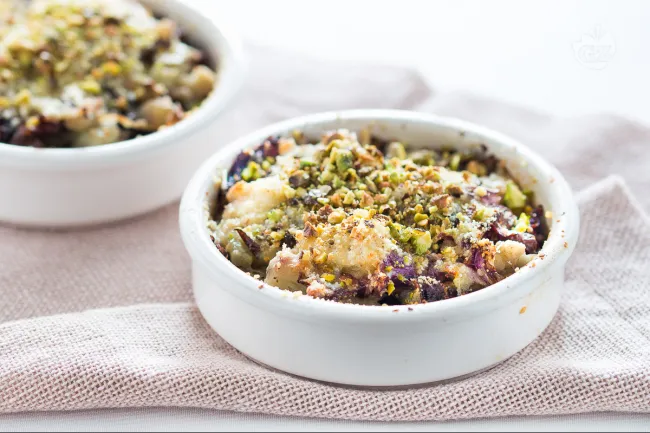 Uno sformato elegante che trasforma due ortaggi invernali in un contorno ricco di carattere, dove la dolcezza del cavolfiore si sposa con l'amaro gentile del radicchio. La superficie croccante di pangrattato e Grana Padano racchiude un cuore tenero e profumato, arricchito dalla granella di pistacchi che regala una nota tostata e una piacevole croccantezza.