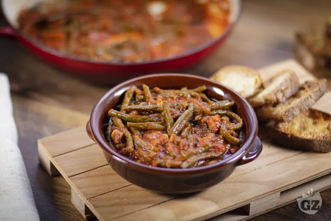 La pancetta affumicata dona una nota salata e carnosa che si sposa con la dolcezza acida dei pomodori pelati, bilanciata dalla freschezza erbacea del basilico e del prezzemolo aggiunti a fine cottura. Questo piatto semplice e sostanzioso è ideale per accompagnare arrosti o formaggi stagionati, ma si presta anche a essere servito come piatto unico leggero, soprattutto nelle serate primaverili ed estive quando i fagiolini sono al massimo della loro tenerezza.
