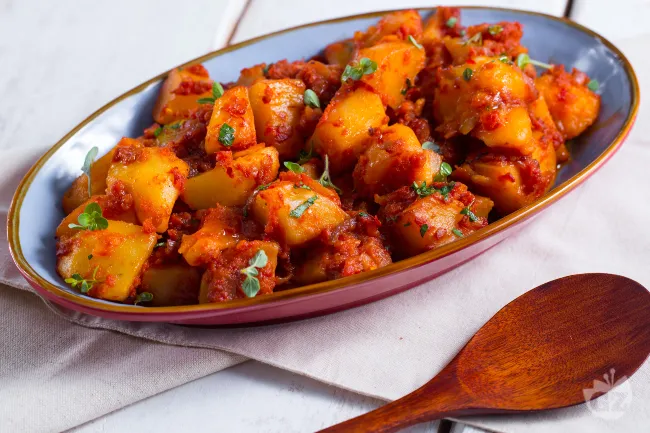 Un contorno rustico e profumato che racconta la semplicità della cucina di campagna. Le patate si ammorbidiscono in un sugo di pomodoro ricco e aromatico, assorbendo i sapori delle erbe fresche e della cipolla caramellata, per un risultato cremoso e avvolgente. La polpa di pomodoro dona una base succosa e leggermente acidula, bilanciata dalla dolcezza delle cipolle rosse soffritte e dal tocco piccante del peperoncino fresco.