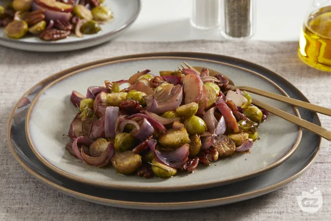 Un contorno invernale che trasforma ingredienti rustici in un piatto ricco di contrasti e profondità. La cottura al forno caramellizza le cipolle e i cavoletti, esaltandone la dolcezza naturale, mentre le mele annurche si ammorbidiscono rilasciando una nota acidula che bilancia il tutto. Le noci pecan tostate aggiungono una piacevole croccantezza e un retrogusto burroso, completando un profilo sensoriale complesso e appagante.