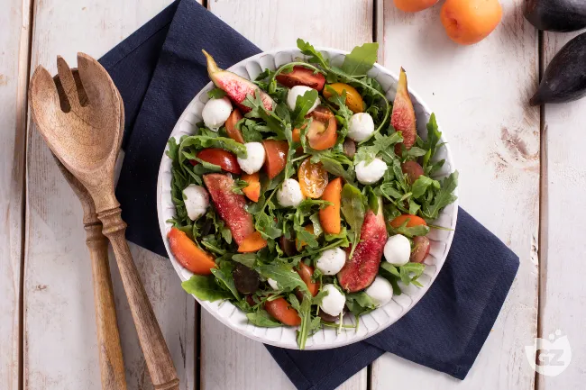 I fichi viola e le albicocche mature regalano una consistenza morbida e zuccherina, mentre i pomodori misti e l'uva rossa offrono una piacevole croccantezza. Le mozzarelline ciliegine, con la loro delicatezza lattea, smorzano l'intensità della rucola pepata, creando contrasti sensoriali avvincenti.