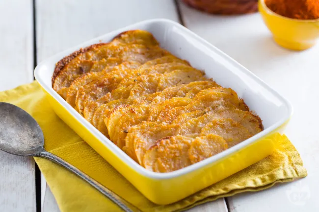 Questa teglia di patate alla paprika è un contorno che conquista per la sua doppia personalità: una croccante gratinatura dorata in superficie e un cuore tenero e cremoso all'interno. Il mix di paprica dolce e affumicata regala un profumo intenso e un sapore caldo e avvolgente, perfettamente bilanciato dalla sapidità del formaggio.