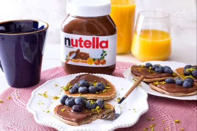 la cremosità intensa della crema spalmabile. La farina di grano saraceno e quella di mandorle donano una consistenza rustica e un profumo tostato, mentre i pistacchi in granella aggiungono una piacevole nota croccante che contrasta con la morbidezza del pancake.