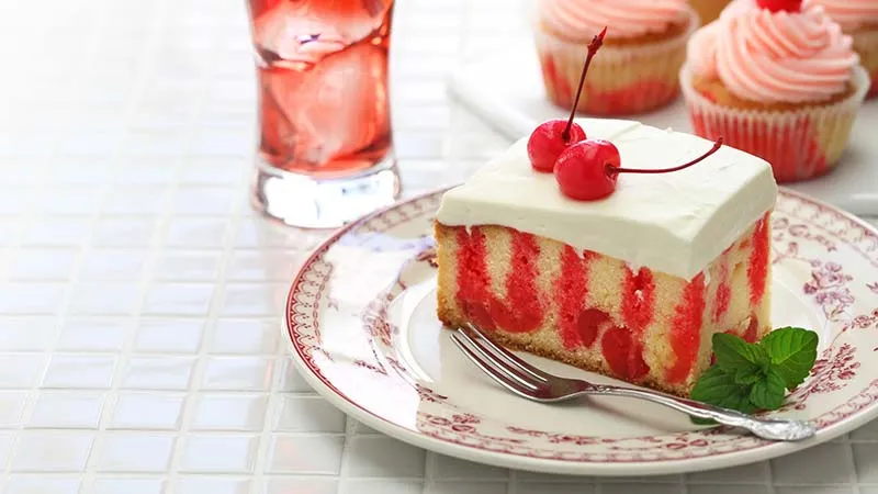 La poke cake è una torta soffice e umida che nasconde una sorpresa golosa: una rete di piccoli fori riempiti di marmellata di lamponi, che si scioglie all'interno della pasta donando un cuore fruttato e intenso. La superficie è ricoperta da un frosting fresco e cremoso al limone, che bilancia la dolcezza con una nota agrumata.