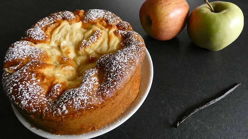 La crema pasticcera, preparata con uova e amido di mais, avvolge il dolce con una texture liscia e setosa, mentre la mela a tocchetti, cotta all'interno dell'impasto, rimane leggermente succosa e profumata. L'aggiunta di zucchero a velo in superficie dona una nota finale di delicatezza e un aspetto invitante.